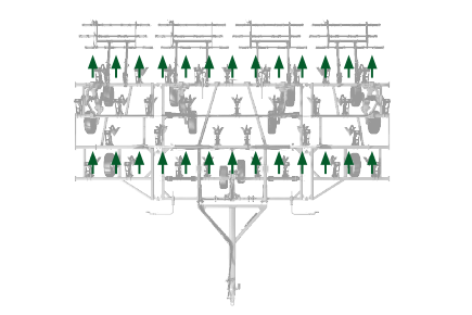 Modular wing extensions increase the working width of the implement by increments of 2, 4 and 6 feet.