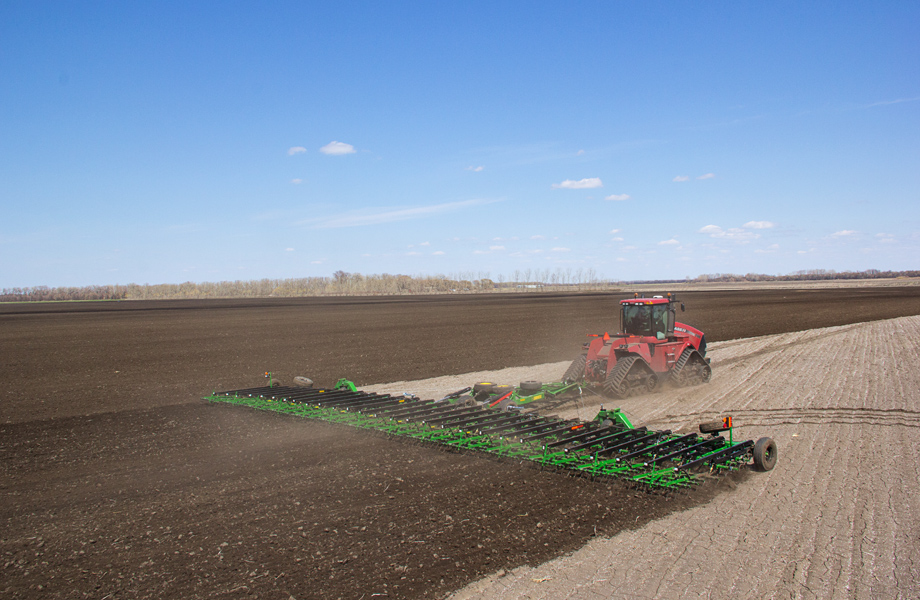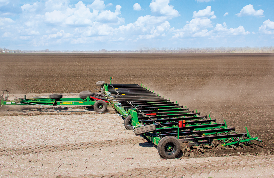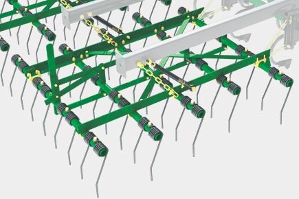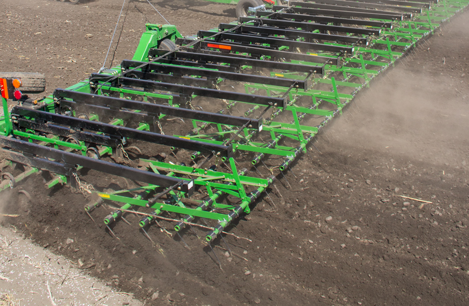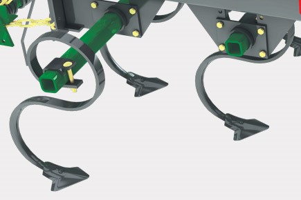 For maximum residue flow the Vibra S-tines are spaced 5 inches apart, with 16-inch spacing between ranks. A hydraulic adjustment feature allows the operator to control working depth. The S-tines can also be completely rotated out of the soil for harrow-only operation. Extended S-tines are centered behind the wheels to cover tracks.